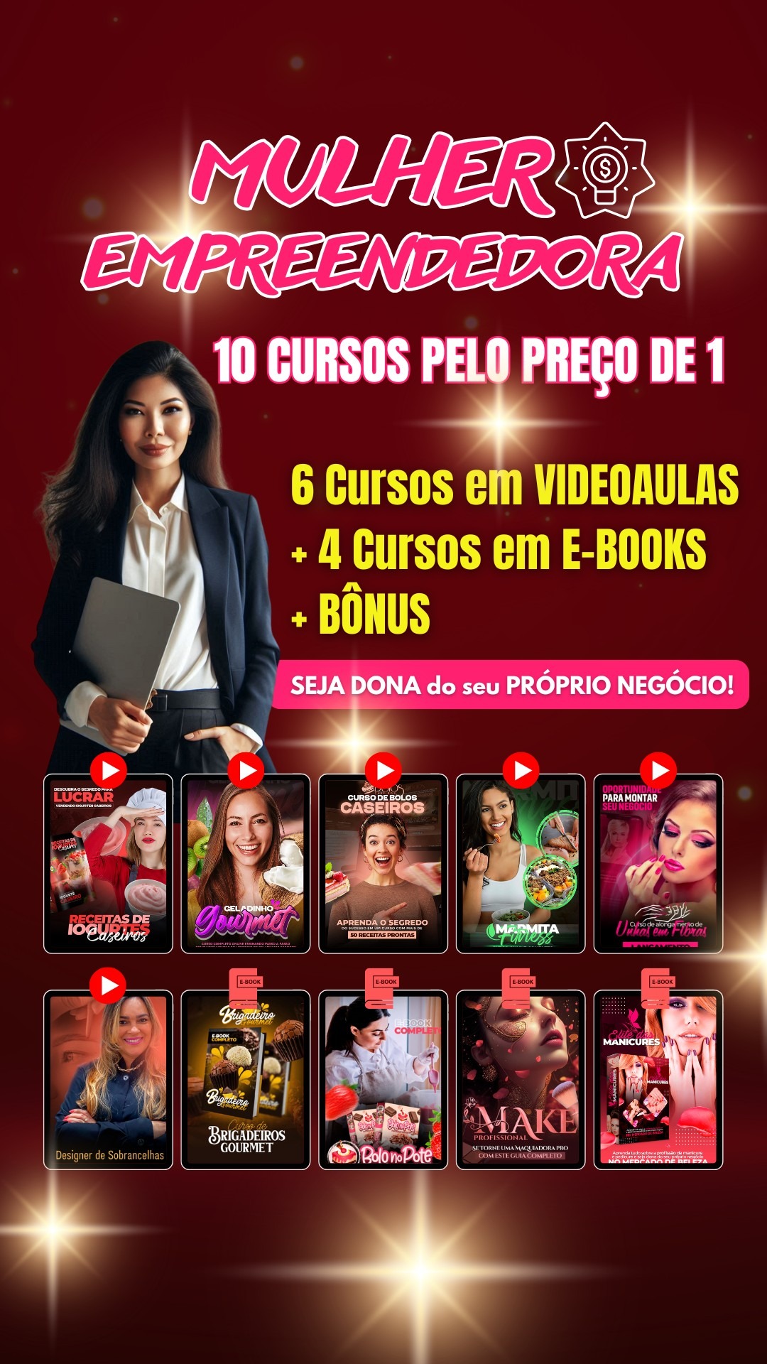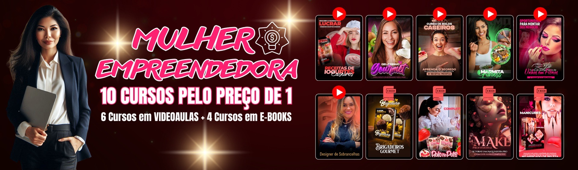 Diversos cursos profissionalizantes para gerar renda extra, cursos de marketing digital em forma de videoaulas ou em E-books.